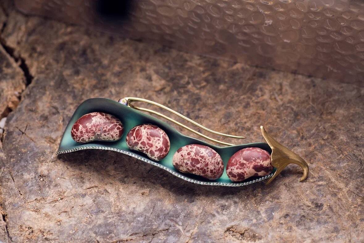 Брошь «Фасоль» отправляется к хозяйке, маме четверых детей 💫 Титан, золото, бриллианты, яшма, зеленый опал. По вопросам индивидуальных заказов пишите только ➡️ @markinjewellery Фотограф Белла Антонио 📸