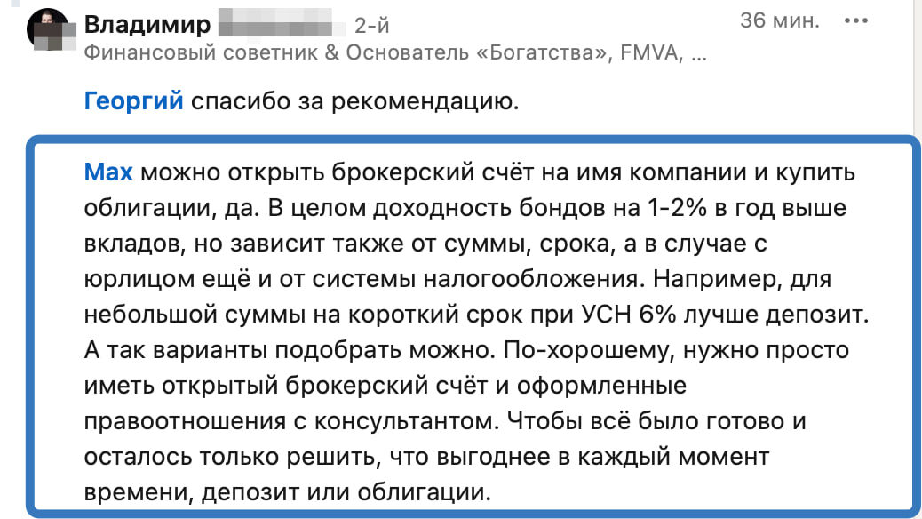 По поводу покупки юр.лицом облигаций - вот, специалист написал (спасибо) комментарий - овчинка, как по мне, выделки не стоит - если на