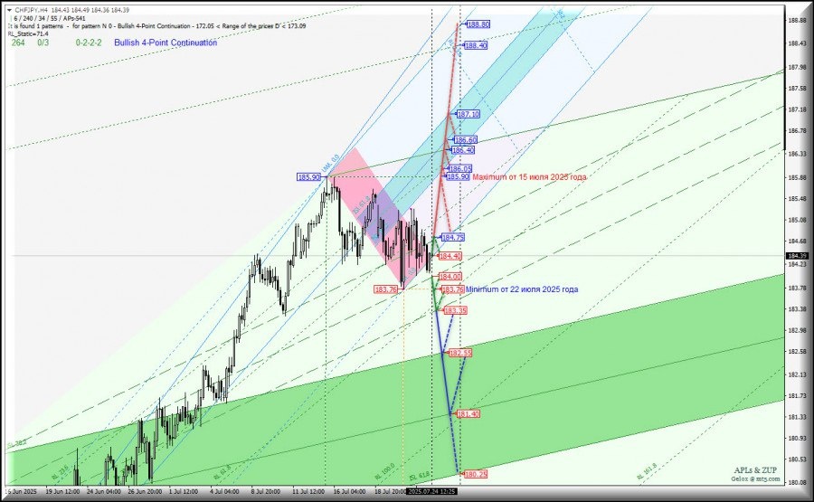 https://basechop.ru/wordpress/?p=50890 Операционный масштаб Minute (таймфрейм h4) CHF/JPY – h4 – обзор вариантов движения c 24 июля 2025 г. ___________________ Swiss Franc vs Japanese Yen Развитие движения CHF/JPY-h4 c 24 июля 2025 года будет обусловлено границами канала 1/2 Median Line (183.35 – 184.00 – 184.75) вил старшего операционного масштаба Minute-h4 и продолжится исходя из отработки и направления пробоя диапазона: – уровень сопротивления 184.40 на начальной линии SSL вил младшего операционного масштаба Minuette-h1; – уровень поддержки 184.00 на 1/2 Median Line Minute-h4. Нисходящее движение. В случае последовательного пробоя уровней поддержки: – 184.00 – 1/2 Median Line Minute-h4; – 183.76 – minimum от 22 июля 2025 года; – 183.35 – нижняя граница канала 1/2 Median Line Minute-h4; нисходящее движение CHF/JPY продолжится к границам зоны равновесия (182.55 – 181.40 – 180.25) вил старшего операционного масштаба Minute-h4. Восходящее движение. Если будет иметь ме
