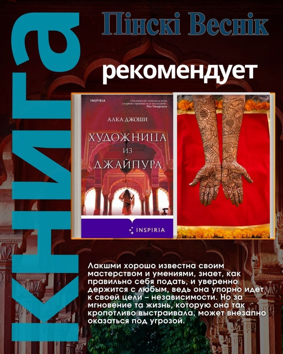 🤍🤍🤍🤍🤍 #ПАК_КНИГ 🤍Алка Джоши "Художница из Джайпура" В 1950-е годы в Индии женщине нелегко быть самостоятельной, но Лакшми от природы умна и талантлива. В семнадцать лет она сбегает от жестокого мужа и оказывается в Джайпуре – роскошном, завораживающем, но суровом и безжалостном городе. Лакшми становится мастерицей мехенди и благодаря удачным связям и знакомствам вскоре оказывается допущенной к самым влиятельным людям. Для дам из высшего общества она не только художница, но и целительница, помощница, доверенное лицо. 📍📍@Пинский Вестник ЮТУБ | САЙТ| ИНСТ | ВК | ОК | ФЕ | Прислать новость