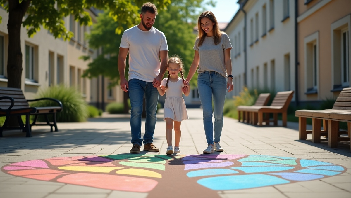 Ольга шла по знакомой улице к автобусной остановке, когда её взгляд упал на яркий рисунок мелом прямо под ногами. Обычно она не обращала внимания на детские каракули, но этот был особенным. На сером асфальте цветными мелками было изображено дерево с раскидистыми ветвями, а на каждой ветке висели маленькие сердечки разных цветов. Под деревом стояли две фигурки, державшиеся за руки.