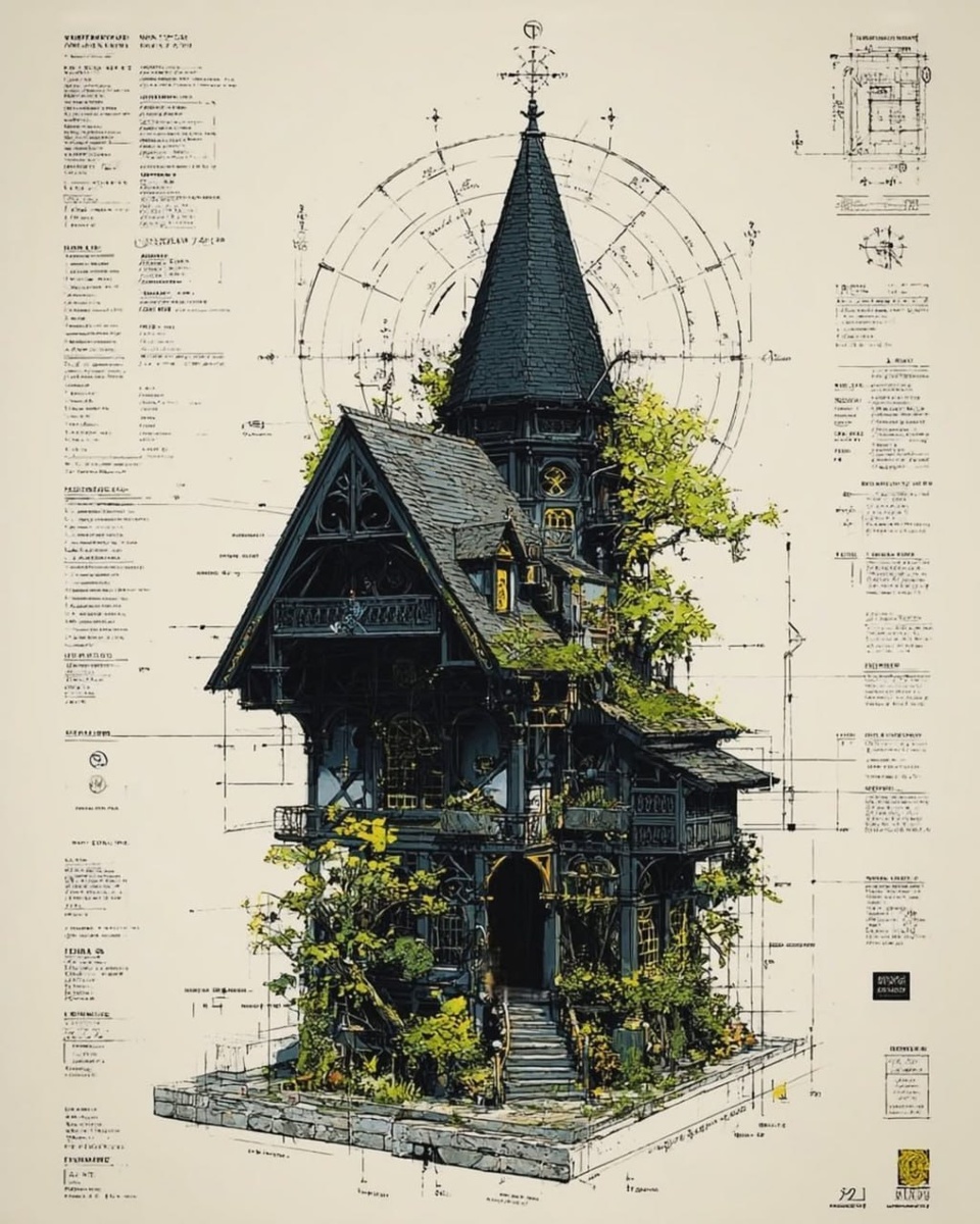Чертежи готических домов с зелёным акцентом. Часть 2. Продолжаем любоваться работами ИИ! 📷 из социальных сетей Ben Myhre #искусство_и_лица Зелёная эстетика 😀