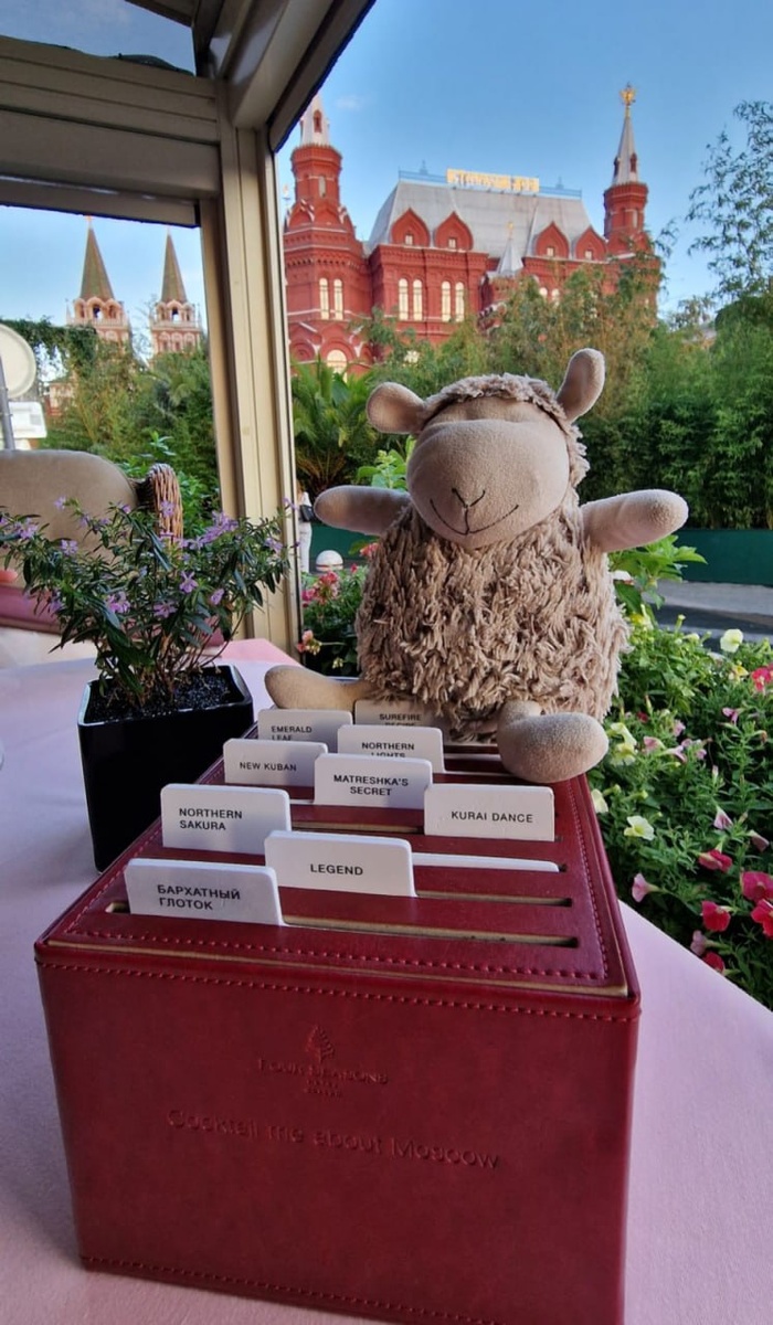 Бесконечные грозы формируют красивые закаты, поэтому Овца Борис решил поужинать на воздухе, глядя на закатное небо. Pourquoi pas? 😏 Выбор пал на веранду бара Московский в Four Seasons Hotel Moscow. Кроме неба и вида на Кремль, вокруг веранды раскинулся настоящий тропический лес – 4-х метровый бамбук, банановые деревья, лианы и пальмы, за что спасибо нашему неутомимому градоначальнику. 😍 Этим летом меню Московского претерпело хорошие изменения. Позиций с едой стало меньше, а коктейлей гораздо больше. Кроме того, всю еду и напитки распределили по городам, областям и регионам России. Так решили знакомить гостей столицы со вкусами нашей необъятной страны. Мы начали, разумеется, с заказа напитков. Меню авторских коктейлей подается в специальном боксе с карточками, на которых есть рассказ о самом напитке, концепции, ингредиентах и т.п. стоимость каждого 1500 руб. В основном все коктейли сладенькие, мы выбирали максимально без сахара. Пробовали на вкус Оренбургскую область с бурбоном -