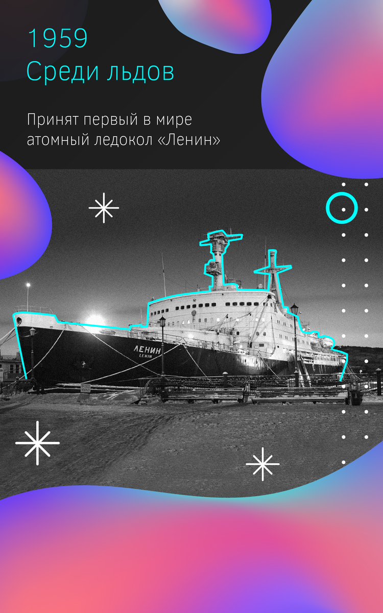 В ноябре 1953 года было принято постановление о строительстве атомного ледокола. Летом 1956 года на Адмиралтейском заводе в Ленинграде состоялась закладка судна, а уже спустя два с половиной года, в декабре 1959 года, его сдали в эксплуатацию. «Наш атомный ледокол «Ленин» будет ломать не только льды океанов, но и льды «холодной войны». Он будет прокладывать путь к умам и сердцам народов, призывая их совершить поворот от соревнования государств в гонке вооружений к соревнованию в использовании атомной энергии на благо человека…» – цитировали газеты Никиту Хрущева.