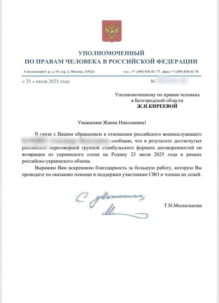 Военнослужащие из Белгородской области вернулись из украинского плена Участники СВО из Белгородской областивернулись из украинского плена в результате достигнутых договорённостей между Россией и Украиной в Стамбуле. Об этом сообщила уполномоченный по правам человека в регионе Жанна Киреева. Обмен военнопленными состоялся на территории Белоруссии 23 июля. Сколько белгородцев вернулось на Родину, пока не уточняется. В Минобороны сообщили, что освобождённые бойцы будут отправлены на лечение и реабилитацию в ведомственные медицинские учреждения. Подписаться на 🗞🗞 | Поддержать бустом
