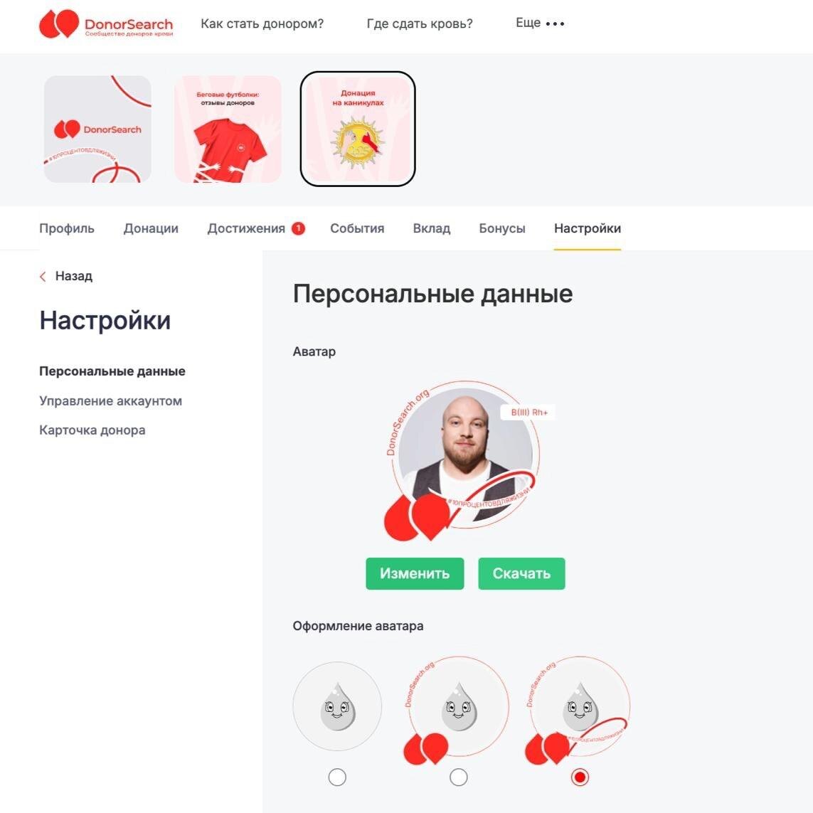 Новое оформление аватарок! Мы выпустили обновление профиля донора и объединили его с нашим челленджем #10процентовдляжизни. Наверняка вы уже замечали в чатах DonorSearch бело-красные аватарки с группой крови донора. Теперь вы тоже можете сделать свою фотографию не только красивой, но и полезной — оформите её в стиле челленджа Как это сделать? 1. Перейдите по ссылке 2. Загрузите свою фотографию и выберите подходящий вариант оформления Вы сможете сохранить изображение и использовать его в других социальных сетях — так вы поможете сообществу привлечь внимание к теме донорства. Не забывайте ставить хэштег #10процентовдляжизни — это поможет другим донорам и всей нашей команде узнавать вас. Подробнее о челлендже и его участниках читайте в этом посте. Хотим увидеть как минимум 100 донорских аватарок этим летом, поможете?) 🧡