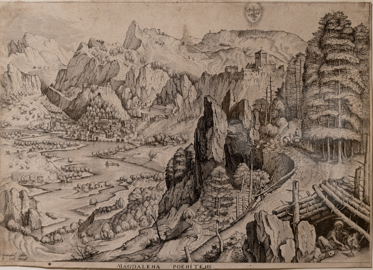Один из главных разделов выставки «Не только Брейгель. Нидерландская гравюра XVI века из собраний Москвы и Санкт-Петербурга» посвящён гравюрам по рисункам Питера Брейгеля Старшего, прозванного Мужицким. Работа этого раздела, «Пейзаж с кающейся Магдалиной», входит в знаменитую серию «Большие пейзажи» (1556). Это был первый крупный совместный проект издателя Иеронима Кока и Питера Брейгеля Старшего — художник предоставлял рисунки, а издатель выпускал гравюры по ним. Гравюру по рисунку Брейгеля выполнили Иоханнес (Ян) ван Дутекюм и Лукас ван Дутекюм. Хотя часть гравюр серии представляет собой пейзажи родной художнику Фландрии, большинство из них, включая данный лист, вдохновлены впечатлениями от путешествий Брейгеля по Италии и Альпам. При создании окончательных рисунков для гравюр Брейгель, вероятно, использовал свои более ранние натурные зарисовки. Гравюра относится к трем листам серии, на которых пейзаж совмещён с религиозными сюжетами. Здесь на первом плане, под навесом из брёвен, изо
