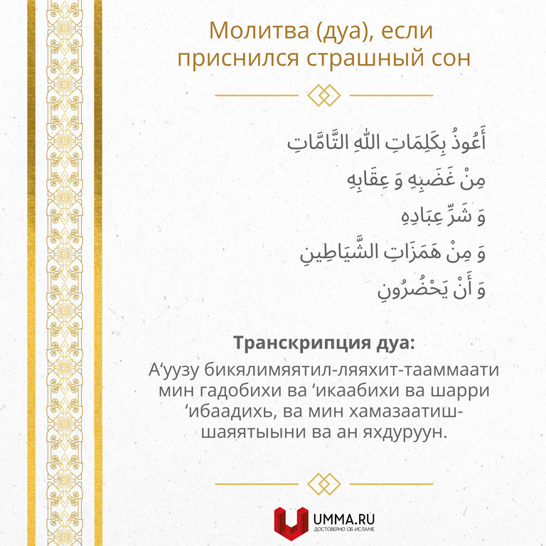 Молитва (дуа), если приснился страшный сон أَعُوذُ بِكَلِمَاتِ اللهِ التَّامَّاتِ مِنْ غَضَبِهِ وَ عِقَابِهِ وَ شَرِّ عِبَادِهِ وَ مِنْ هَمَزَاتِ الشَّيَاطِينِ وَ أَنْ يَحْضُرُونِ Транскрипция дуа: А‘уузу бикялимяятил-ляяхит-тааммаати мин гадобихи ва ‘икаабихи ва шарри ‘ибаадихь, ва мин хамазаатиш-шаяятыыни ва ан яхдуруун. Перевод дуа: «Я прибегаю [за помощью] к совершенным словам Аллаха (Бога, Господа) от Его гнева и наказания, от зла людей. [Я прибегаю за помощью к совершенным словам Аллаха, удаляясь] от дьявольских наущений». В хадисе, где приведена данная молитва, четко сказано: «Кто прочитает ее, тому никакого вреда от страшного сна не будет». (Сунан ат-Тирмизи №3528) Эта мольба-ду‘а может быть актуальна всегда, когда вы столкнулись с тем, что напугало вас и ужаснуло. Как во сне, так и наяву. Прочитав ее, осознав ее, вы сразу почувствуете облегчение. Известный сподвижник ‘Абдулла ибн ‘Амр обучал своих детей этой мольбе-ду‘а. Периодически читал ее на них. А если они были еще