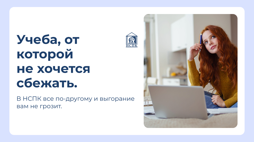 Думаете, что выгорание наступает от лекций, тестов и сессий? Это вовсе не так! Опустошение вызывает не сама учеба, а то, что она поглощает все время и силы. В НСПК все по-другому и выгорание вам не грозит. А все потому, что вы учитесь дистанционно, а значит — остаетесь в балансе. Не надо тратить часы на дорогу, жить по звонку и откладывать любимые дела «на потом». Здесь можно совмещать образование и жизнь — без перегруза.