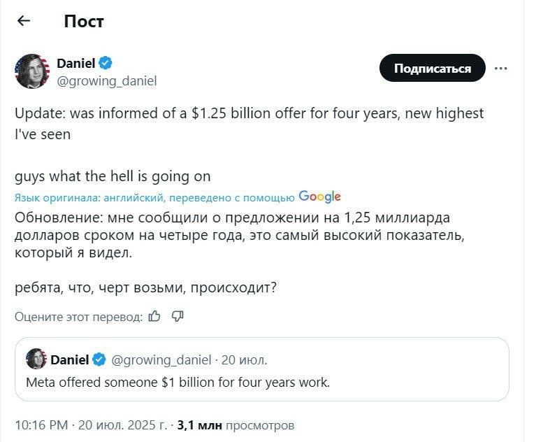 ΠΎΡΡΠ΅ΡΠΎΠ² Π² ΡΡΠ΅ΡΠ΅ ΠΈΡΠΊΡΡΡΡΠ²Π΅Π½Π½ΠΎΠ³ΠΎ ΠΈΠ½ΡΠ΅Π»Π»Π΅ΠΊΡΠ°. ΠΠ½Π΅ ΡΠΎΠΎΠ±ΡΠΈΠ»ΠΈ ΠΎ ΠΏΡΠ΅Π΄Π»ΠΎΠΆΠ΅Π½ΠΈΠΈ Π½Π° $1,25 ΠΌΠ»ΡΠ΄ Π·Π° ΡΠ΅ΡΡΡΠ΅ Π³ΠΎΠ΄Π° β ΡΡΠΎ ΡΠ°ΠΌΠ°Ρ Π²ΡΡΠΎΠΊΠ°Ρ ΡΡΠΌΠΌΠ°, ΠΎ ΠΊΠΎΡΠΎΡΠΎΠΉ ΠΌΠ½Π΅ ΠΏΡΠΈΡ
