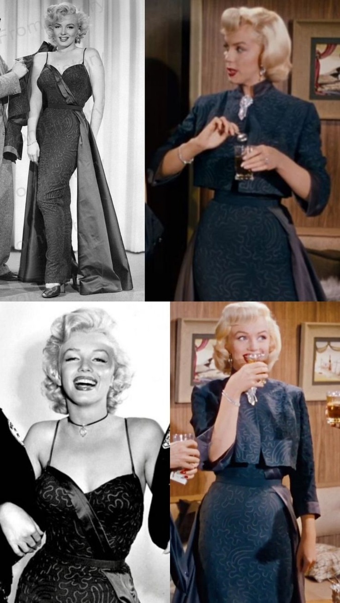 Вечерний ансамбль, состоящий из платья и жакета болеро, Уильяма Травиллы для героини Лорелей Ли в фильме "Джентльмены предпочитают блондинок" (1953). Цвет описан как баклажаново-стальной серый. Тесьма выложена меандровым узором. Элегантный костюм подчёркнут двумя тренами (шлейфами) из баклажанового атласа.