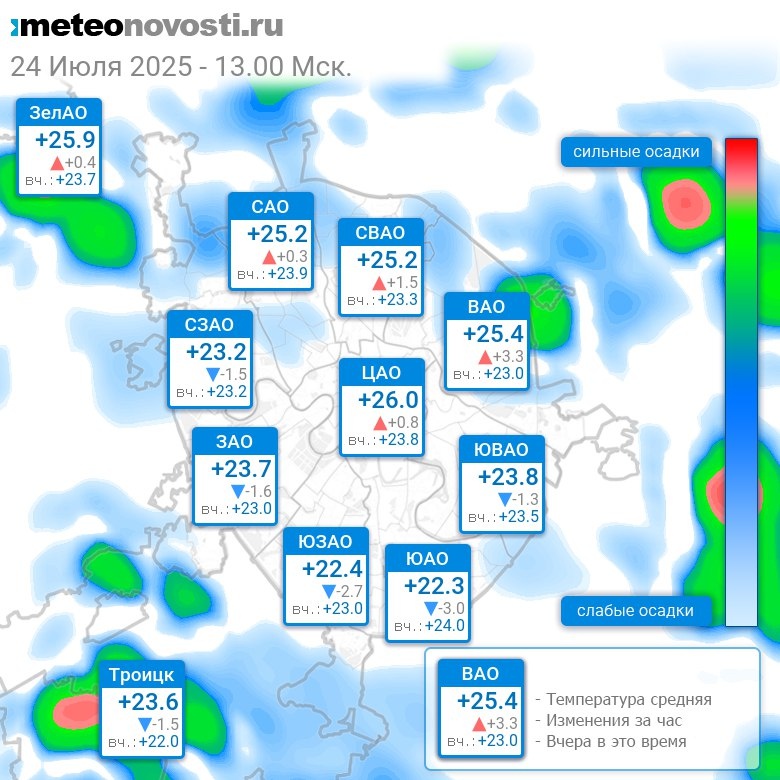 В 13:00 в Москве было от +20.2°C до +28.5°C, средняя температура +24.6°C #погода #Москва #лето #температура #24июля #четверг