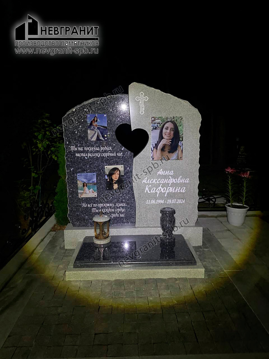 Выбор памятника для близкого человека – это сложный и деликатный процесс. Хочется, чтобы он не только увековечил память, но и передал всю любовь и скорбь, которые испытывают родные и друзья. Сегодня я хочу рассказать об уникальном памятнике, созданном в память об Анне Александровне Кафориной, который поражает своей нежностью и душевностью. Дизайн, говорящий о любви: Этот памятник – настоящее произведение искусства. Он выполнен из двух видов гранита: тёмного и светлого. Тёмный гранит символизирует скорбь и утрату, а светлый – светлую память и любовь. Сердце, вырезанное между стелами, соединяет эти два мира, подчёркивая неразрывную связь между ушедшей Анной и её близкими. Фотографии, оживляющие воспоминания: На памятнике размещены фотографии Анны в разные периоды её жизни. Это позволяет увидеть её улыбку, вспомнить счастливые моменты и ощутить, что она всегда рядом. Трогательные слова: На тёмной стеле выгравированы строки, полные скорби и любви. Эти слова, идущие от самого сердца, выра