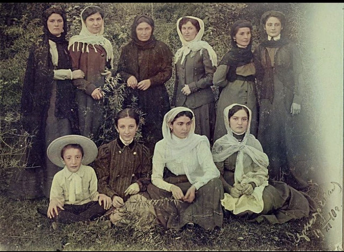 Осетинки станицы Черноярская Моздокского отдела, 20 ноября 1910 г. Стоит вторая слева в белом платке Госса Мистулова (сестра генерал-майора Эльмурзы Мистулова). Четвёртая Саса Бегиева (Валаева) — дочь войскового старшины Валаева Петра Васильевича и Дарьи (Дарицка) Николаевны Гокинаевой, которая построила кладбищенскую церковь. Стоит вторая справа Люба Кургосова. Сидит справа Фариза Бугулова (воспитывалась в семье Мистулова Э.А.), рядом с ней сидит вторая справа — Вера Галаева, дочь полковника Галаева Василия Савельевича, застреленного абреком Зелимханом, сестра Нади и Володи. (@Obnovlenijemira)