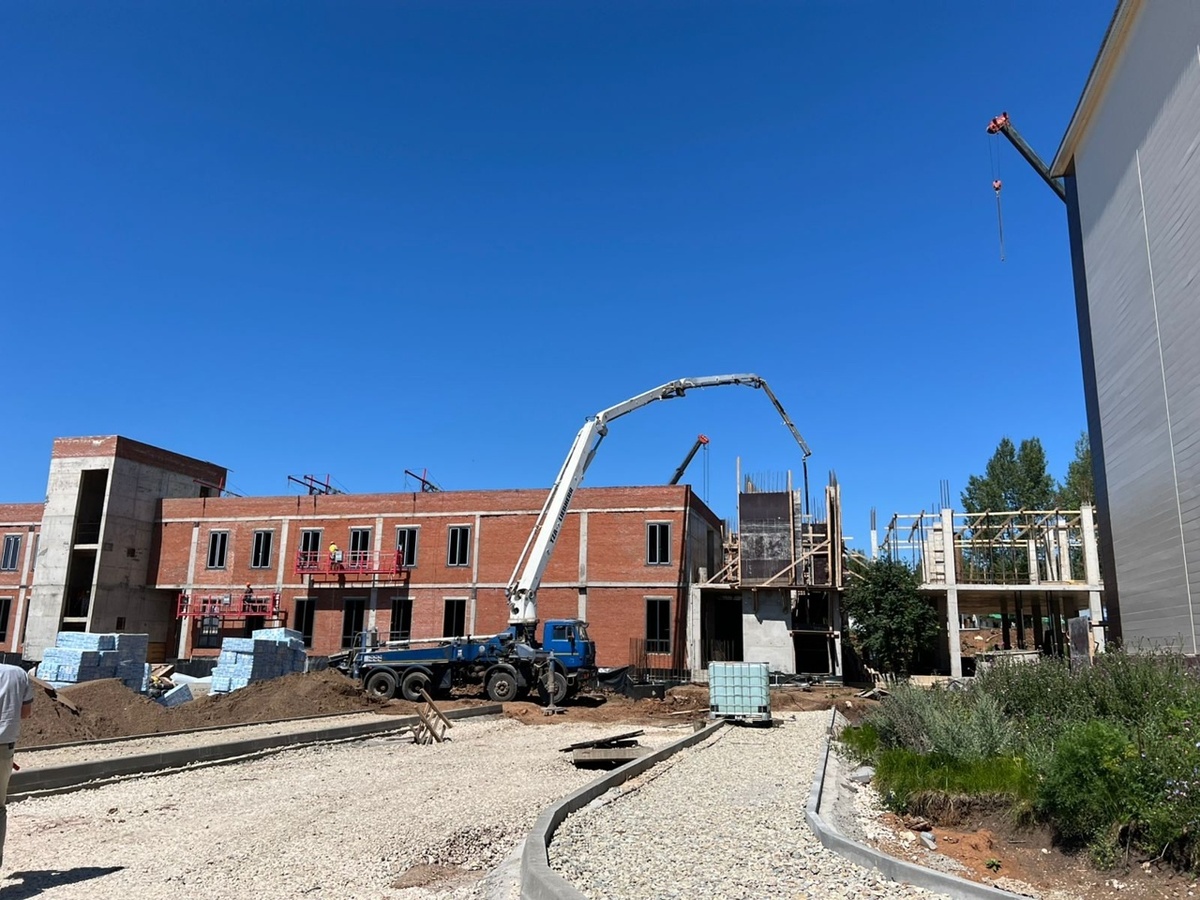На данный момент на объекте продолжаются комплексные строительные работы по возведению монолитных конструкций, кирпичной кладке стен и перегородок, установке инженерных коммуникаций, а также ведутся отделочные и кровельные мероприятия.