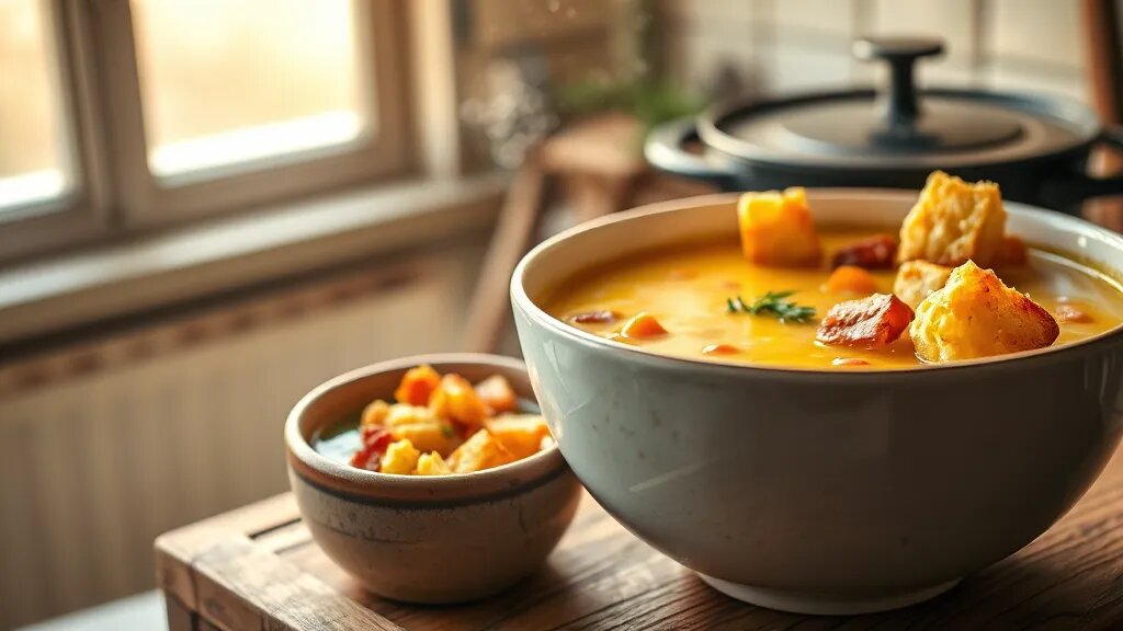 А теперь – кульминация! Рядом с тарелкой ставим пиалу или небольшую тарелочку с нашими горячими гренками с копченостями. Не насыпайте их в суп сразу! Это важно. Каждый должен сам управлять своим хрустящим счастьем. Пусть гренки подаются отдельно, сохраняя свой максимум хруста и аромата.