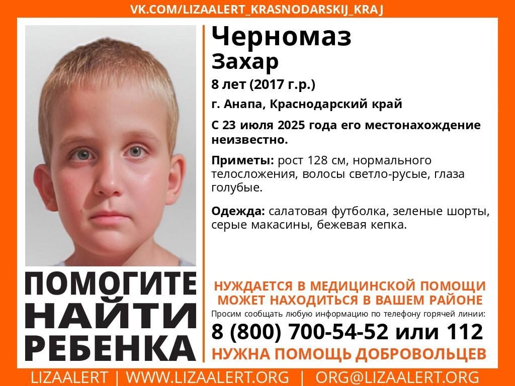В Анапе пропал 8-летний мальчик, нуждающийся в медпомощи Волонтёры поисково-спасательного отряда «Лиза Алерт. Краснодарский край» просят помочь в розыске Захара Черномаз. С 23 июля его местонахождение неизвестно. В ориентировке указано, что рост ребёнка 128 см, нормального телосложения, волосы светло-русые, глаза голубые. Был одет: салатовая футболка, зеленые шорты, серые мокасины, бежевая кепка. Отмечается, что потерявшийся 8-летний мальчик нуждается в медицинской помощи. Всех, кто обладает какой-либо информацией о местонахождении Захара просят позвонить по телефону «горячей линии» ПСО «Лиза Алерт»: 8 (800) 700-54-52 (звонок бесплатный) или инфорг поиска Лиляна (Сербия), телефон: 8-918-668-04-28. Подписаться на Новости Анапы