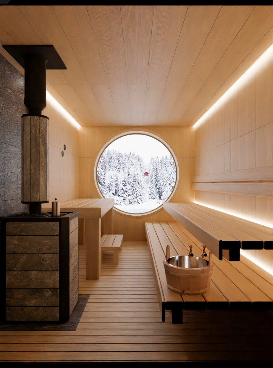 Стены и потолок выполнены из панелей Rohol, производство в Австрии. Панели разработаны специально для высоких температур саун и парных и имеют сертификат европейского качества.