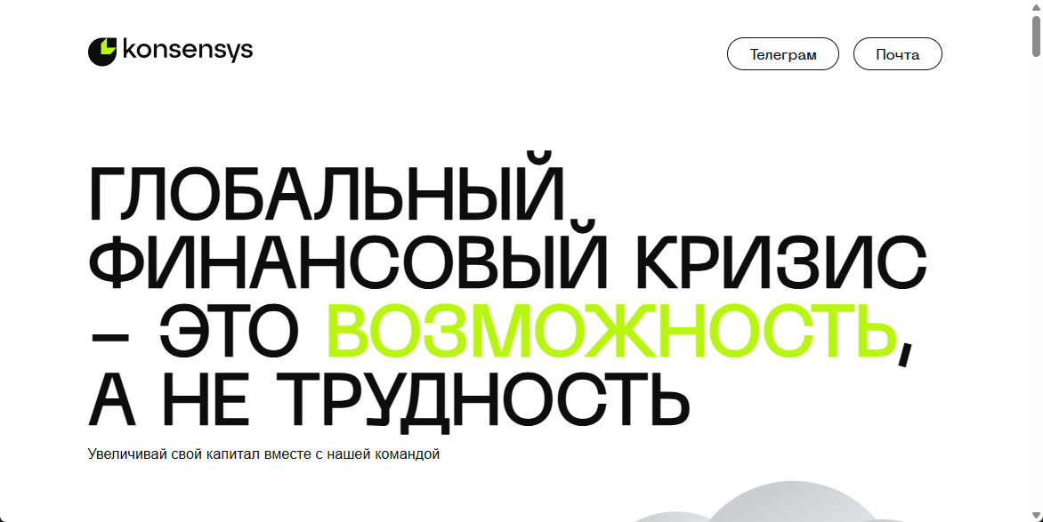 Компания Konsensys позиционирует себя как инвестиционный проект, ориентированный на обеспечение пассивного дохода и финансовой безопасности клиентов. Компания заявляет, что ее команда состоит из профессиональных трейдеров, которые управляют средствами инвесторов, совершая сделки с криптовалютами, акциями и облигациями, а затем распределяют полученную прибыль. Посреднические услуги предоставляются через ресурсов, включая каналы и боты в Telegram , что способствует повышенной стабильности работы сервиса независимо от внешних факторов: Проект поддерживает русский и другие языки. Информация о руководстве «Консенсис» представлена в ограниченном объеме и касается только профессионального опыта основателей и их финансовых активов. Дата создания компании не раскрывается, а отсутствие официальных документов затрудняет проверку указанных в нижней части ресурса регистрационных данных. На сайте нет сведений о наличии лицензий, регулировании деятельности и других юридических аспектах, что может вы