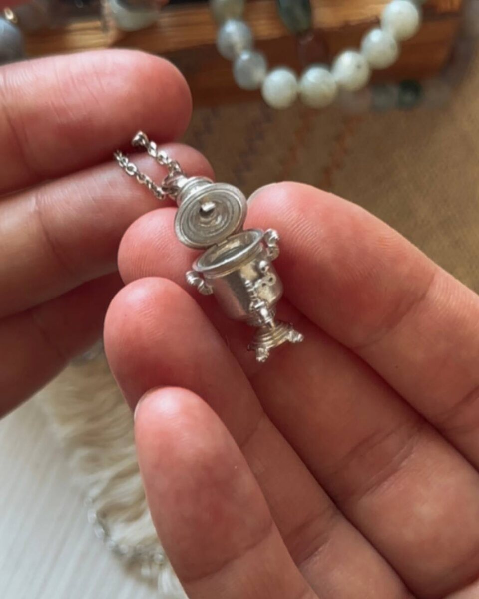 У меня самовар ассоциируется с детством — вспоминаю, как дедушка в детстве топил самовар шишками на даче, и чаепитие превращалось в целое событие, на которое звали соседей. Теперь этот кулончик - моя личная машина времени✨