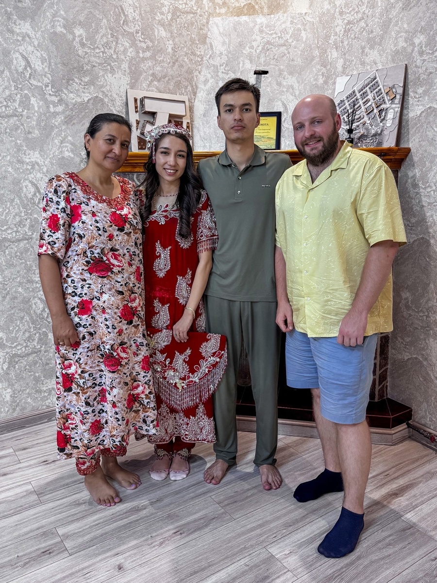 Путешествие в сердце Евразии позволило мне наведаться в дом моего старого знакомого Жавохира. Только вот сам Жава (как его зовут друзья) сейчас учится в Германии (я гостил у него в марте), поэтому меня встретили его мама Азиза Абдулхафизовна, брат Махсум, невеста Махсума - Камилла, а также младшая сестра - Назокат. Я уже гостил в этом доме в декабре 2021 года. Уверен, некоторые из вас помнят, как я был в Самарканде на свадьбе двоюродного брата Жавы и Махсума — Фариза. Писал про это пост. А в июне этого года свадьбу сыграли Махсум и Камилла. Признаюсь, что меня звали, но прилететь на само торжество у меня не вышло. Зато с удовольствием посетил их дом сегодня. Камилла меня встретила в национальном костюме. Со свадьбы еще не прошло 40 дней, поэтому, когда приходят гости, надо соблюдать традиции. И, конечно, накормить гостя пловом, который получился очень вкусным! На прощание мы сделали совместную фотографию. Спасибо Махсуму, Камилле, Назокат и Азизе Абдулхафизовне за такой теплый прием. С