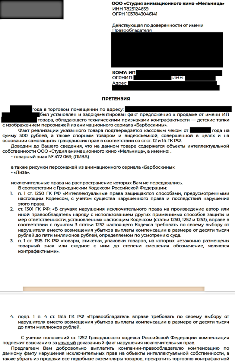 В случае подтверждения факта реализации контрафактной продукции в Вашей торговой точке или на онлайн-платформе, правообладатель имеет законное основание обратиться в судебные инстанции с требованием о выплате денежной компенсации за нарушение его исключительных прав.