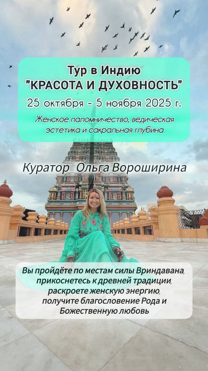 ✨ Куратор — Ольга Вороширина, мастер духовных и родовых практик, энергохиллер, мастер кундалини-йоги, знаток священных писаний, куратор ведических церемоний в Индии, проводник в сердце священной земли Вриндавана. Вас ждёт глубокое погружение в мир Божественного🕉️, женская настройка🌸, живые даршаны, древние мантры🎶, парикрамы, а также внутренние и внешние трансформации, которые откроются мягко и мудро.