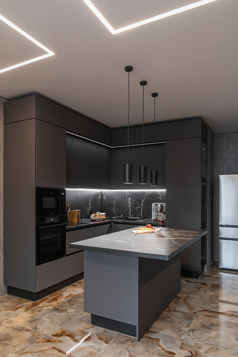 Тёмная кухня с фрезерованными фасадами и встроенной подсветкой.