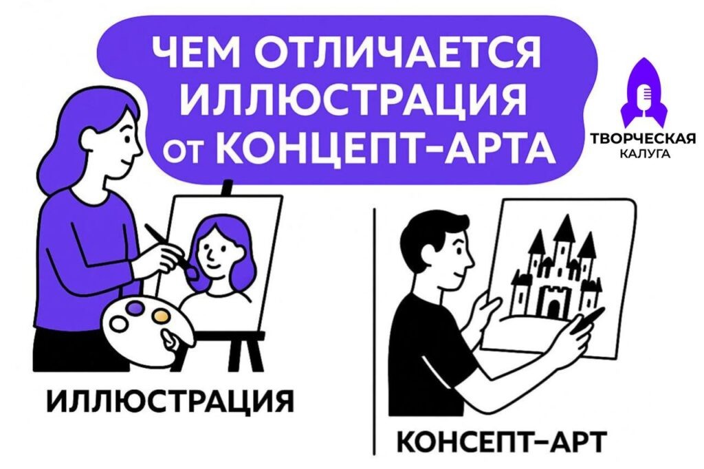 В сказке «Алиса в стране чудес» иллюстратор изображает ключевые сцены: чаепитие с Шляпником, встречу с Чеширским котом. Зритель должен почувствовать атмосферу истории и узнать персонажей. Концепт-арт — это предварительное изображение, которое помогает визуализировать идеи, миры, персонажей или объекты до начала их реализации в кино, играх или анимации. Это не финальное произведение, а рабочий материал для команды: реж