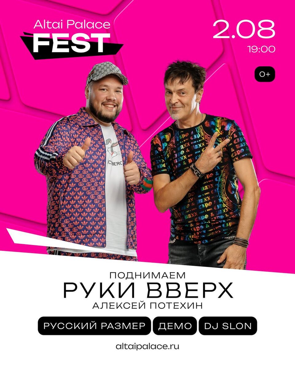 Группа «Поднимаем РУКИ ВВЕРХ» 🪩 Altai Palace Fest’25 Дискотека 90-х 🪩 Любимая группа, хиты которых мы будем знать наизусть всю жизнь! 🔥 «Крошка моя», «Чужие губы», «18 мне уже», «Студент», «Он тебя целует»… список можно продолжать бесконечно! А лучше приехать и насладиться вживую 🥰 Altai Palace Fest - это непередаваемая атмосфера, тысячи гостей, киловатты звука, масса развлечений, улыбки, счастье и радость!❤️ 📅 Встречаемся 2 августа в 19:00 📍 Большая сцена курорта Altai Palace 🤳 8-800-444-15-13 📌 Купить билет: altai-fest.ru
