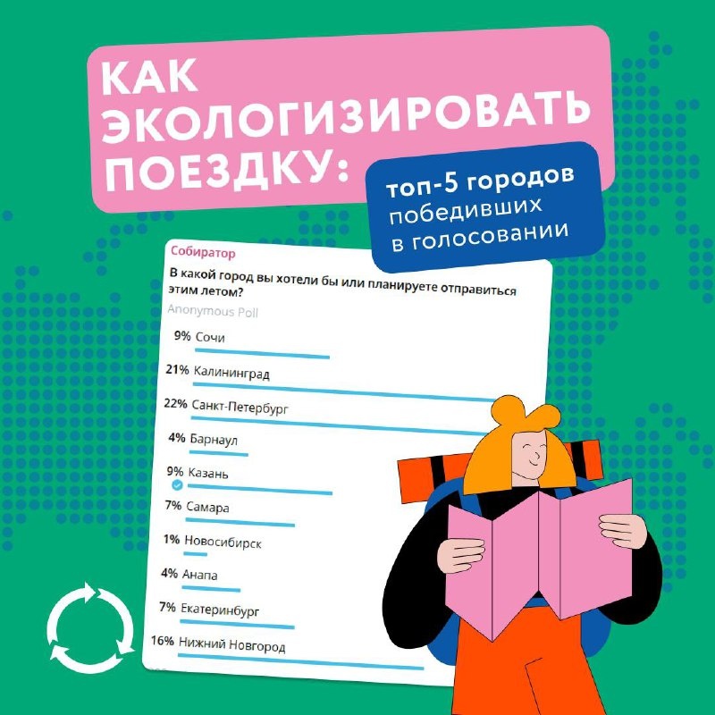 Как же это приятно, отправляясь в путешествие, взять любимые зелёные привычки с собой 🌿 А что, если представить, что возможность продолжать следовать своим привычкам и помогать планете — это доступно? Рассказываем, как экологизировать поездку в города, в которые вы хотели бы или планируете отправиться этим летом. Вот топ-5 городов, за которые вы проголосовали — Санкт-Петербург (22%), Калининград (21%), Нижний Новгород (16%), Казань и Сочи (набрали по 9%). ⛱ Санкт-Петербург: центр города — просто находка для экологиста. Лампочки, батарейки, металл, одежда, контейнеры для пластиковых карт и пластиковых бутылок — всё можно найти в пешей доступности. Загляните в кофейню Limitless и другие, где можно взять напитки в свою тару. Чтобы не покупать воду в пластике, а налить в свой термос или многоразовую бутылку — приходите в бар «Фогель», в «Шумерийскую кофейню» в Северном флигеле Фонтанного Дома или в буфет «Мадам Пеку». А ещё в Санкт-Петербурге находится Эконцентр Собиратора — заглядыва