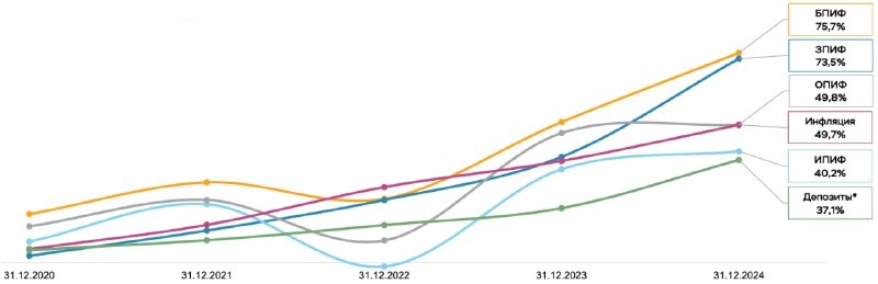ЦБ назвал самые доходные типы паевых инвестфондов за последние 5 лет ЦБ назвал самые доходные типы паевых инвестфондов за последние 5 лет За последние пять лет в 2020-2024 годах наибольшую накопленную доходность среди российских паевых инвестиционных фондов (ПИФ) для неквалифицированных инвесторов показали биржевые фонды (БПИФ) на уровне 75,7%. Об этом рассказала директор департамента инвестиционных финансовых посредников Банка России Ольга Шишлянникова на конференции «Рынок коллективных инвестиций 2025», которую проводит в Санкт-Петербурге ассоциация брокеров НАУФОР. Ее слова передает корреспондент « Инвестиций». Лучшими по доходности в 2020-2024 годах стали следующие типы фондов: Биржевые ПИФ (БПИФ) доходность 75,7% Закрытые ПИФ (ЗПИФ) доходность 73,5% Открытые ПИФ (ОПИФ) 49,8% Интервальные ПИФ (ИПИФ) 40,2% ️Для сравнения: накопленная инфляция за тот же период составила 49,7%, совокупная за 5 лет доходность банковских вкладов 37,1%. При этом в отдельно взятом 2024 году самыми