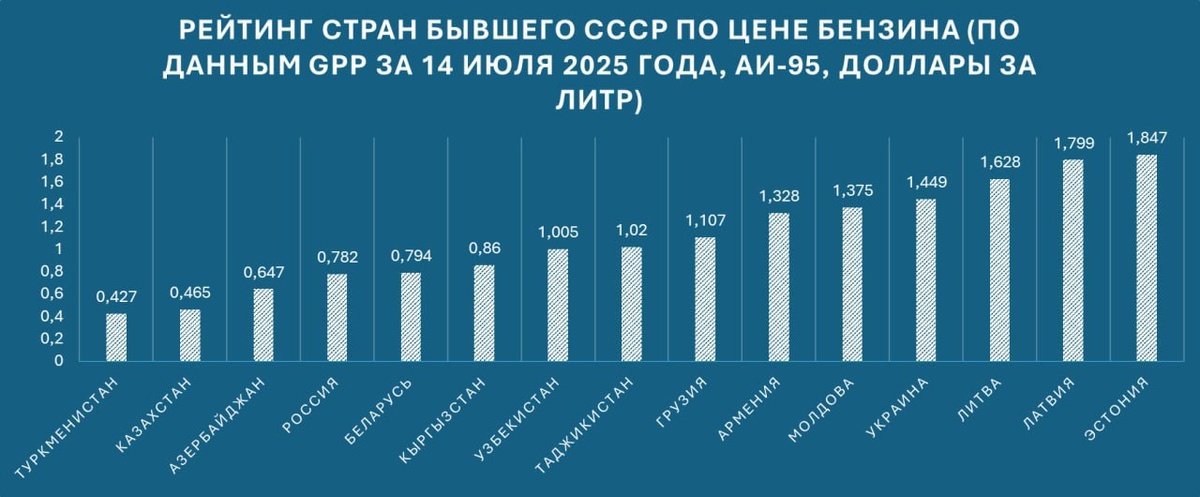Рейтинг составлен порталом Global Petrol Prices среди стран бывшего СССР и выстроен по цене бензина АИ-95 в долларах за литр на 14 июля 2025 года.