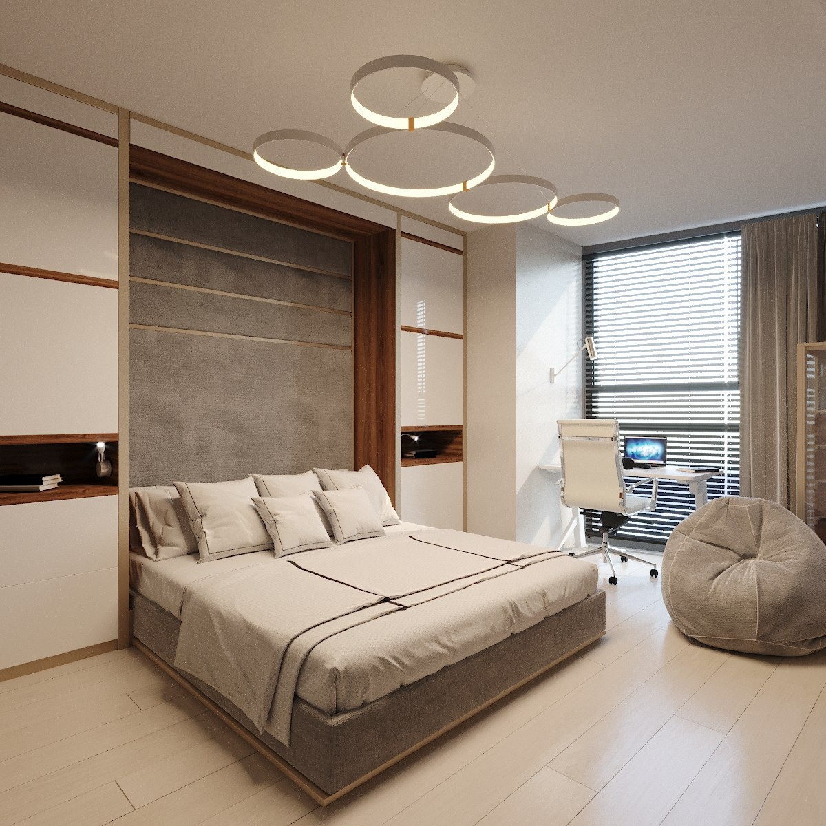 На визуализации интерьера практически все модели я делал сам, кроме люстры и пола (материал и плашки дерева).