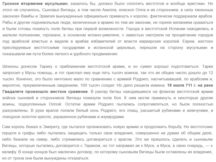 Что меня заставило её написать? У меня возникла путаница в упоминаемых фактах о гибели Родериха — короля вестготов. Согласно общепринятым фактам, он погиб в битве при Гвадалете в 711 году. Но я наткнулся на одну из статей по истории Испании VI–VII веков, где автор описывает интересные события, отличающиеся от большинства информации по части гибели короля: С чем мы здесь сталкиваемся? Принято считать, что Родерих погиб в битве при Гвадалете в 711 году, но никакой конкретики о том, как именно это произошло, нигде не упоминается. В этом тексте автор пишет о том, что король не только выжил, но, бежав в Эмериту, ещё и планировал продолжать сопротивление захватчикам.