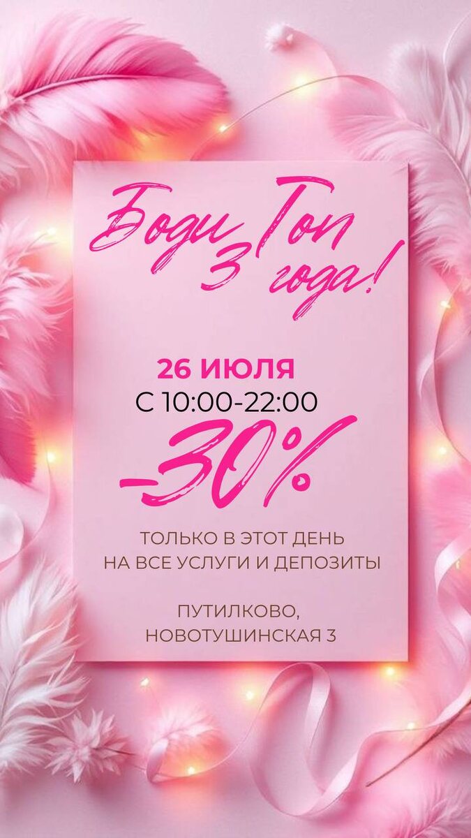 26 июля студия Боди топ отмечает 3 года! 🎂🥳 В этот замечательный день мы приглашаем вас на торжество, посвященное нашему празднику! 🎈