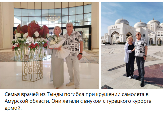 Так, канал 112 сообщает, что среди погибших была семья врачей из Тынды, которая летела домой после отдыха в Турции. Галина и Алексей Найденовы летели вместе со своим внуком, об этом рассказала их дочь. Галина проработала 40 лет акушером-гинекологом, ее муж столько же трудился в сфере функциональной диагностики.