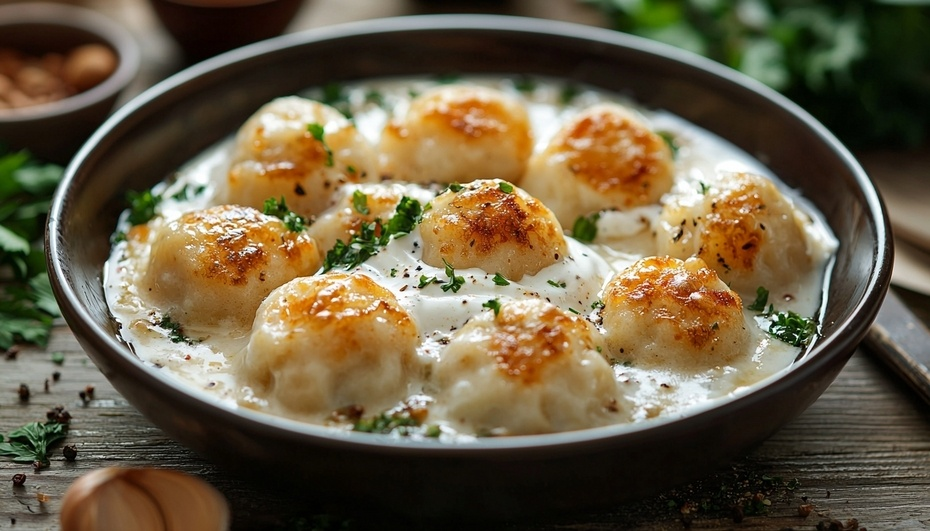 Пельмени - 500 гр. Сметана - 200 гр. Майонез - 2 ст. ложки Вода кипяченая - 1 стакан Сыр (по желанию) - 100 гр. Подсолнечное масло - для сковороды Приправы: Хмели-сунели, молотый перец, сухой чеснок соль - по вкусу В отдельной емкости смешать сметану, майонез, воду и приправы. В раскаленную сковороду налить немного подсолнечного масла, добавить пельмени. Обжаривать на сковороде до золотистой корочки. Когда появиться корочка, влить соус в сковороду, накрыть крышкой и томить 10 минут. После истечения времени, снять крышку и выпаривать воду 5 минут. Возьмите терку и над сковородой натрите сыр, накройте сковороду крышкой. Можете снимать сковороду с печи. Сыр расплавиться за счет жара (2-3 минуты).