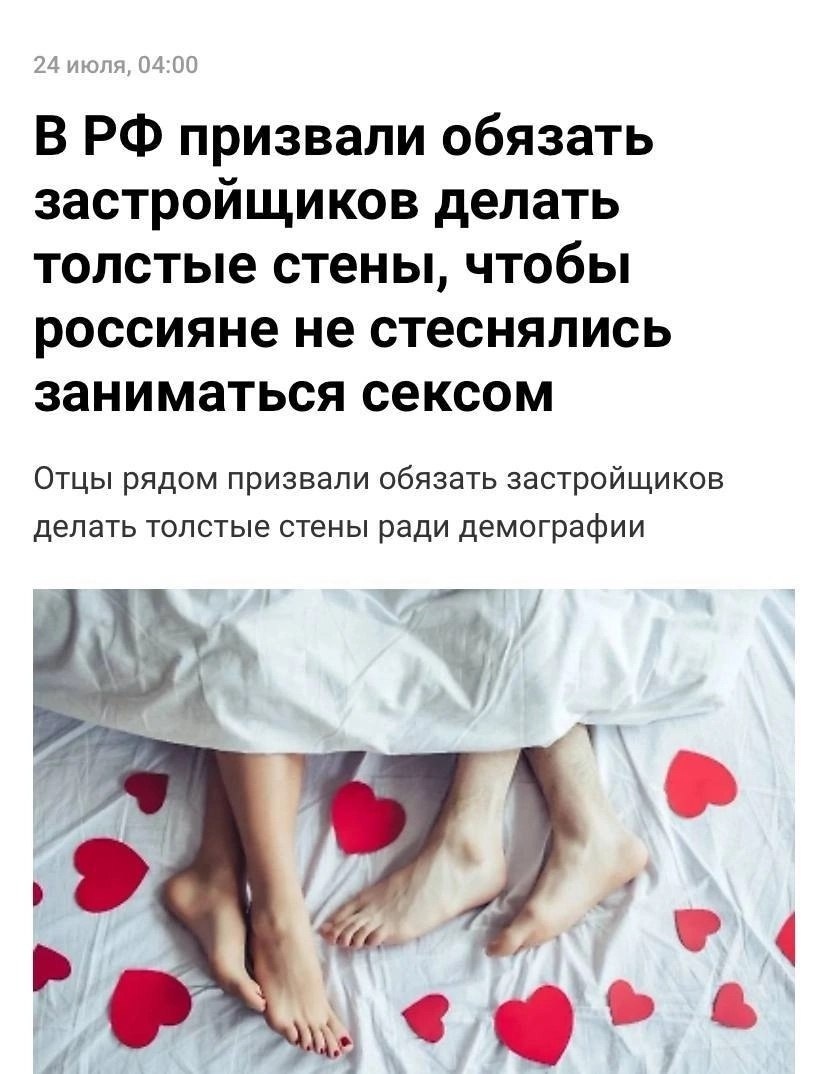 ⚡ В России предлагают строить дома с толстыми стенами — чтобы людям не мешало заниматься сексом Общественники обратились в Минстрой с нестандартной инициативой: улучшить звукоизоляцию в новостройках. По их словам, тонкие стены мешают интимной жизни россиян и в итоге влияют на демографию Что предлагают: ➖ Использовать материалы с хорошей шумоизоляцией; ➖ Обязать застройщиков следить за этим нормативом; ➖ Тем самым создать «здоровую атмосферу для семьи и брака». Шарья – столица мира Крупнейшее городское СМИ Источник