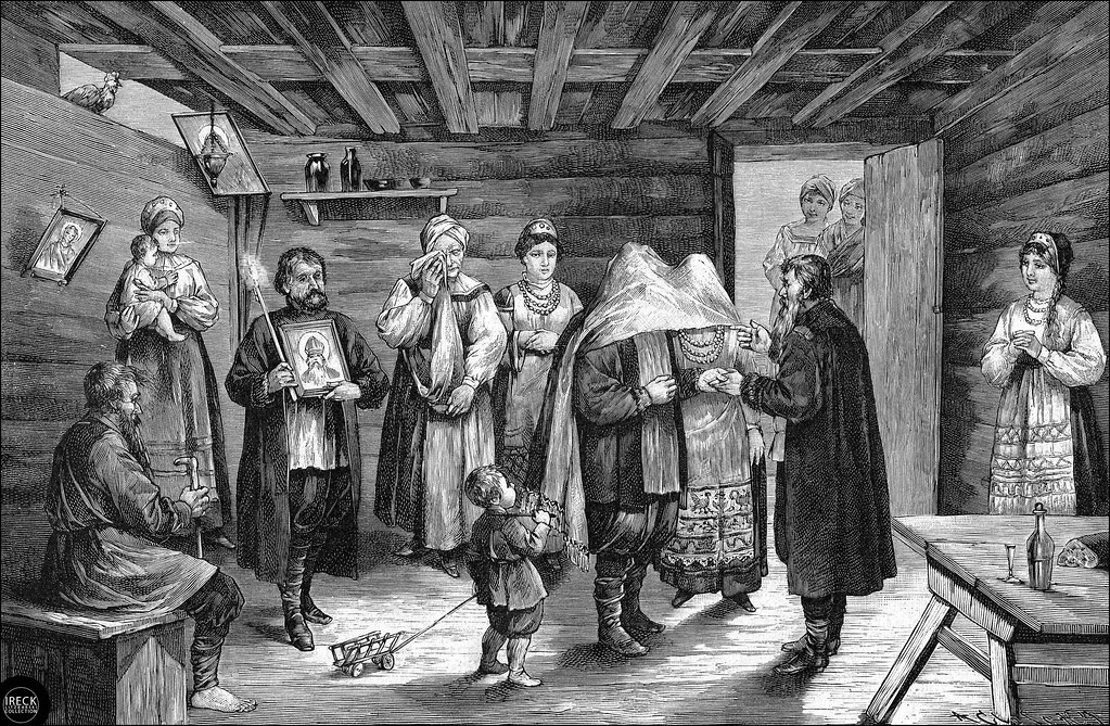 В сговоре скрупулезно перечислили приданое невесты: «шуба баранья новая, шубец кумачовый новый с пухом и с сукном красным, с кружевом мишурным, нашивки золотные да серги-лапки, другие серьги, двои четки, цепочки со кресты, четыре перстня позолочены, кружева жемчюжные, сорока жемчюжная (Сорока — женский нарядный головной убор, украшение шапки) на шапку – два рубля денег».
