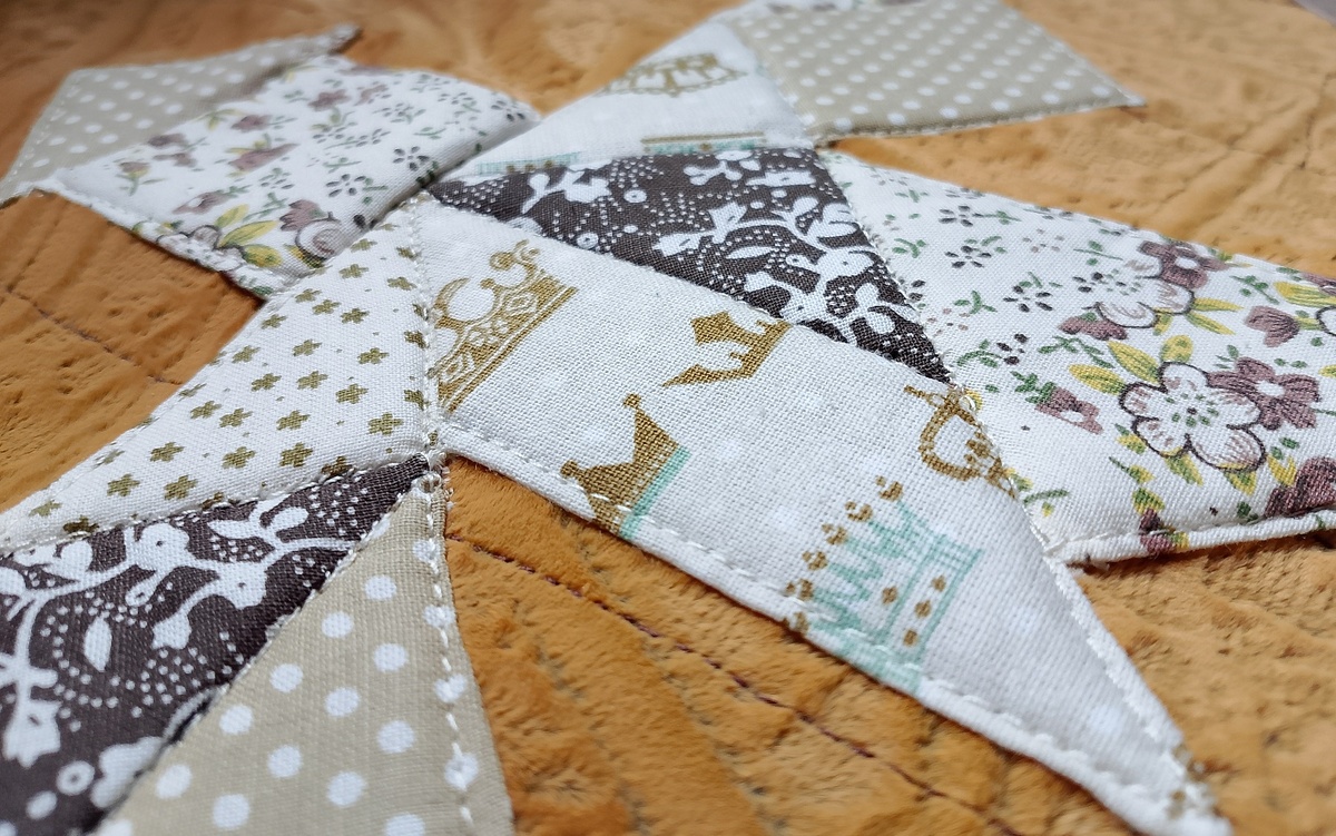 Ткань обивки мне прислала внимательная вышивальная подруга после того, как я рассказала ей о своём долгострое. Эта ткань потрясающе мягкая и пушистая, хочется прикасаться к ней просто так. И по цвету я у себя не смогла найти ничего более подходящего, а теперь думаю, что это именно тот оттенок, который нужен: с ним не сливается лоскутная фигура, и он немного перекликается с рисунком на нескольких лоскутах.