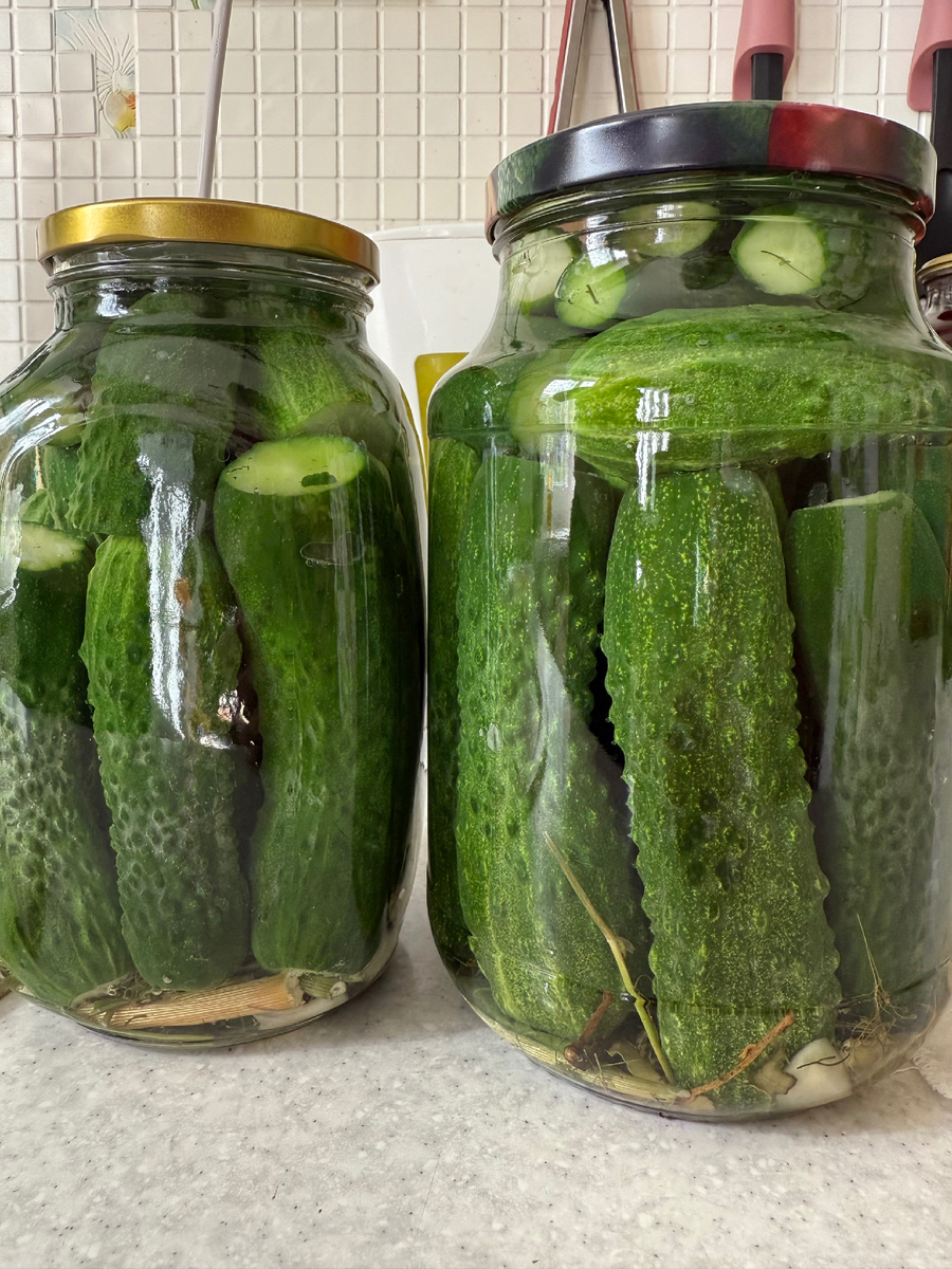 По этому рецепту моя мама закатывает огурцы уже лет 30. И желания поменять рецепт никогда не возникало. Вот и с Вами поделиться решили. Огурцы хорошо следует помыть, «попки» по желанию можно отрезать. Банки для закатки просто хорошо моем. Объем выбирайте сами исходя из аппетита и размера огурцов. На дно каждой баночки выкладываем лисья хрена, сухой укроп вместе со шляпками и палками, пару зубчиков чеснока, перец горошком и лавровый лист. Наполняем банку огурцами как нравится и заливаем кипятком. Накрываем крышкой и оставляем до остывания. Далее эту же воду сливаем и доводим до кипения и снова заливаем. Когда она остынет до комнатной температуры снова сливаем и доводим до кипения и перед тем как залить добавляем непосредственно в сам бутыль : из расчета на 3л банку с огурцами меряем 50-ти граммовыми рюмочками сахар - 1 рюмочка соль - 1 рюмочка уксус - 1 рюмочка. Заливаем кипяченым сиропом и закатываем. Зимой хрустим и оливье вкуснючее кушаем.