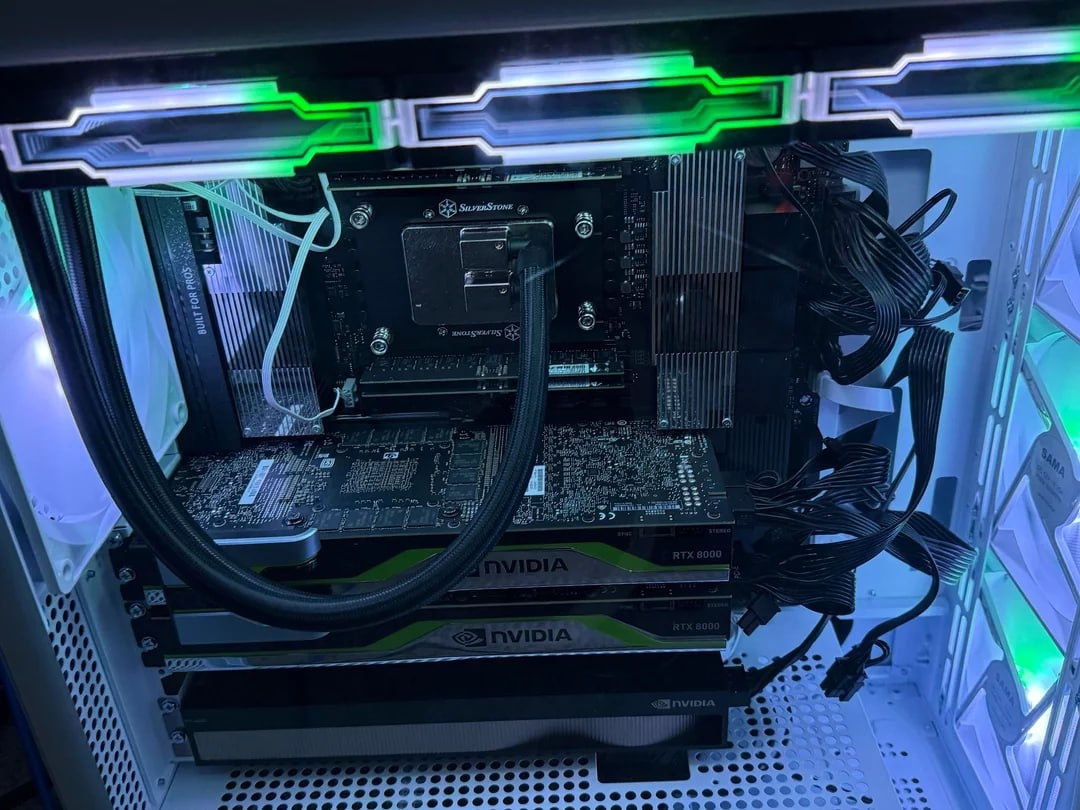 История с Реддита - парень собрал мощный компьютер для локальных нейронок, и это настоящий монстр. У него две карты Quadro 8000 и одна A6000, вместе дают 144 гигабайта видеопамяти, процессор Threadripper 7945WX, 128 гигабайт оперативки ECC DDR5 на 6000 мегагерц.