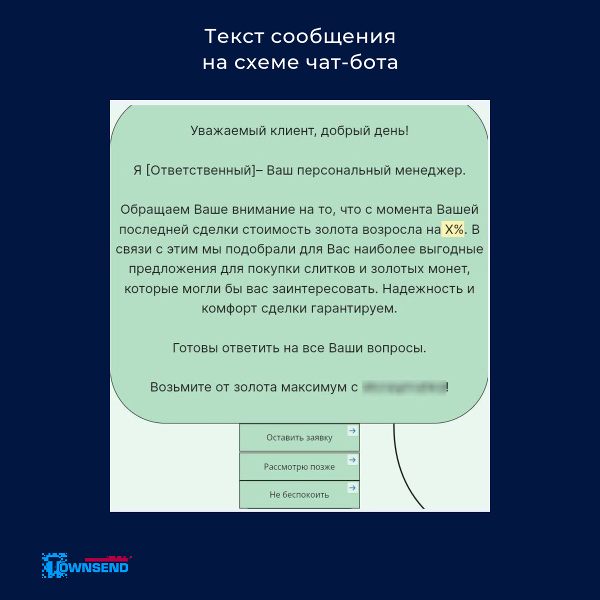 Наши специалисты «в рамках обычных доработок» реализовали небольшую, но очень крутую механику, которая помогает пользователям ориентироваться при покупке золота. Как это работает? Это триггерная рассылка — при наступлении определённого события в жизни клиента чат-бот запрашивает курс золота через API у Центрального банка России. Если курс поднимается на определённый процент и выше от цены предыдущей покупки клиента, чат-бот автоматически отправляет сообщение. В сообщении сразу видно, на сколько процентов выросла стоимость, и можно тут же оформить заявку или нажать «Не беспокоить» , если стало неактуально. Просто, удобно и с заботой о клиентах! 💎 Больше заметок о WhatsApp для бизнеса читайте в нашем канале на Дзен: Townsend: мессенджеры и чат-боты. Немного о нас. Мы — агентство мессенджер-маркетинга Townsend с шестилетним опытом работы в мессенджерах и чат-ботах. Если вам необходимо разработать чат-бот, обращайтесь!