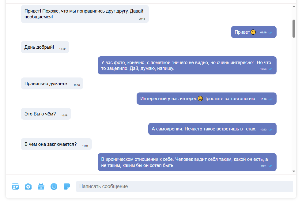 Понимая все это, я затеиваю переписку в надежде нащупать что-то общее, как-то заинтересовать и самой заинтересоваться. А вдруг получится пройти чуть дальше, чем обычно. В связи с этим хочу показать вам полностью одну такую переписку с моими мыслями по ходу.