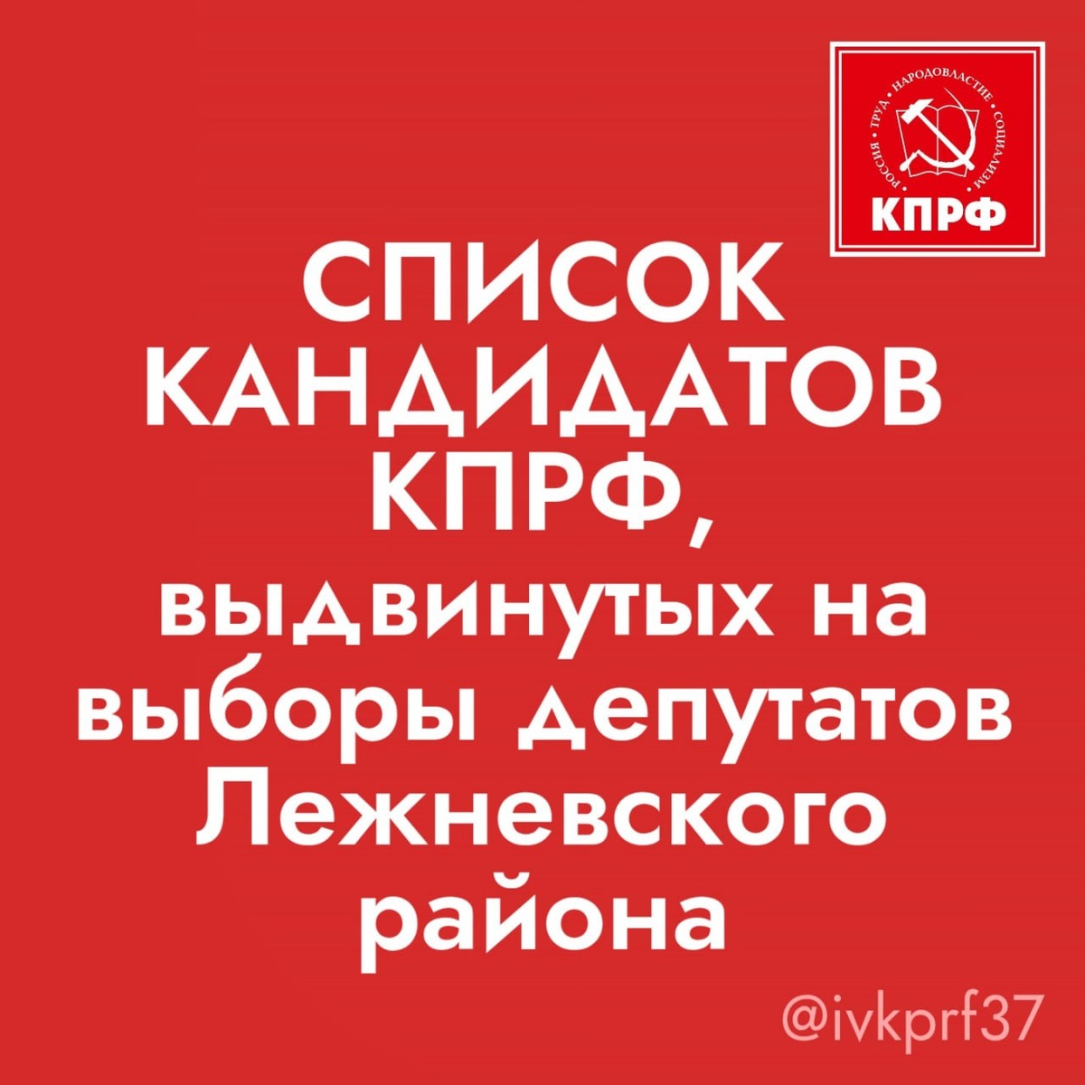 Лежневское городское поселение В Совет Лежневского городского поселения Лежневского муниципального района Ивановской области пятого созыва от Ивановского областного отделения КПРФ выдвинуты: ✅Иванов Михаил Алексеевич 11.05.1970 года рождения, индивидуальный предприниматель. Округ №2. ✅Петров Евгений Павлович 20.10.1944 года рождения, член КПРФ, первый секретарь Комитета Лежневского районного отделения КПРФ. Округ №3. Лежневское сельское поселение В Совет Лежневского сельского поселения Лежневского муниципального района Ивановской области третьего созыва от Ивановского областного отделения КПРФ выдвинут: ✅Лебедев Павел Николаевич 13.01.1971 года рождения, водитель ООО «ТрансСервис», член КПРФ. Округ №1. Новогоркинское сельское поселение В Совет Новогоркинского сельского поселения Лежневского муниципального района Ивановской области пятого созыва от Ивановского областного отделения КПРФ выдвинуты: ✅Исакова Екатерина Александровна 06.11.1985 года рождения, домохозяйка. Округ №1.