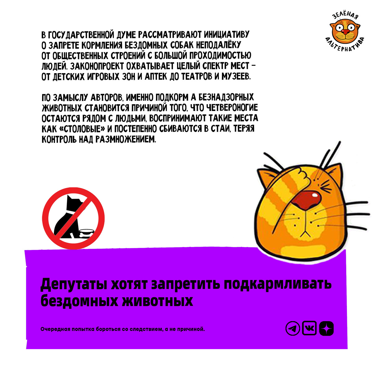В Государственной Думе рассматривают инициативу о запрете кормления бездомных собак неподалёку от общественных строений с большой проходимостью людей. Законопроект охватывает целый спектр мест — от детских игровых зон и аптек до театров и музеев. По замыслу авторов, именно подкормка безнадзорных животных становится причиной того, что четвероногие остаются рядом с людьми, воспринимают такие места как «столовые» и постепенно сбиваются в стаи, теряя контроль над размножением. Мы убеждены, что депутаты вновь пытаются бороться со следствием, а не с причиной. Никто никого бы и не подкармливал, если бы в проблемных регионах велась комплексная работа по регулированию численности популяции бездомных животных: регулярный отлов, обязательная стерилизация, создание приютов, муниципальный контроль и строгий учёт домашних питомцев. Но вместо всех этих эффективных мер слуги народа вводят очередной бессмысленный запрет. Проблема свор уличных собак для российских городов — не выдумка. Но запретить разд