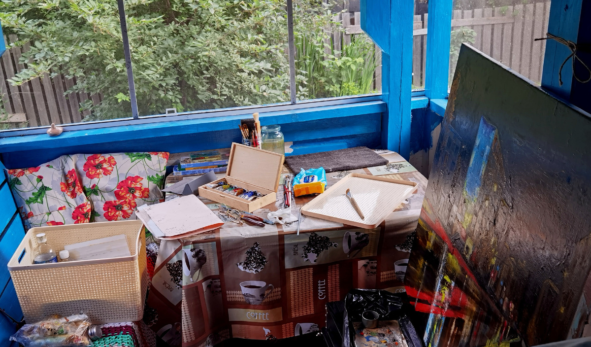 Самый главный мой творческий проект этого лета - это, конечно же, картина, которую я пишу для участия в выставке в городе Когалыме в августе этого года. Раньше я об этом уже упоминала и писала, что выбрала для реализации свой задумки большой (для меня) формат: почти что А1 (размер листа ватмана) холста на подрамнике. Выпендрилась, в-общем. А "выпендрилась" - это потому, что я не очень-то представляла, как я с таким форматом буду работать - станка-то у меня нет! И понеслось.... Как я только не вертела этот холст! Показываю: Вариант №1. На веранде. Причем, на веранде было три варианта местонахождения объекта: на столе, на табурете у стола и на полу. Вариант №2. На этюднике во дворике дачи: Еле сообразила, как закрепить картину на небольшом этюднике, чтобы она не сверзилась на травку. Это, примерно, как сенбернара в "Оку" засунуть... Но все обошлось, ничего никуда не упало. И даже комары не сильно мешали процессу. Вариант №3. Тоже во дворике, но уже на столе, плашмя. Длинная палка на с