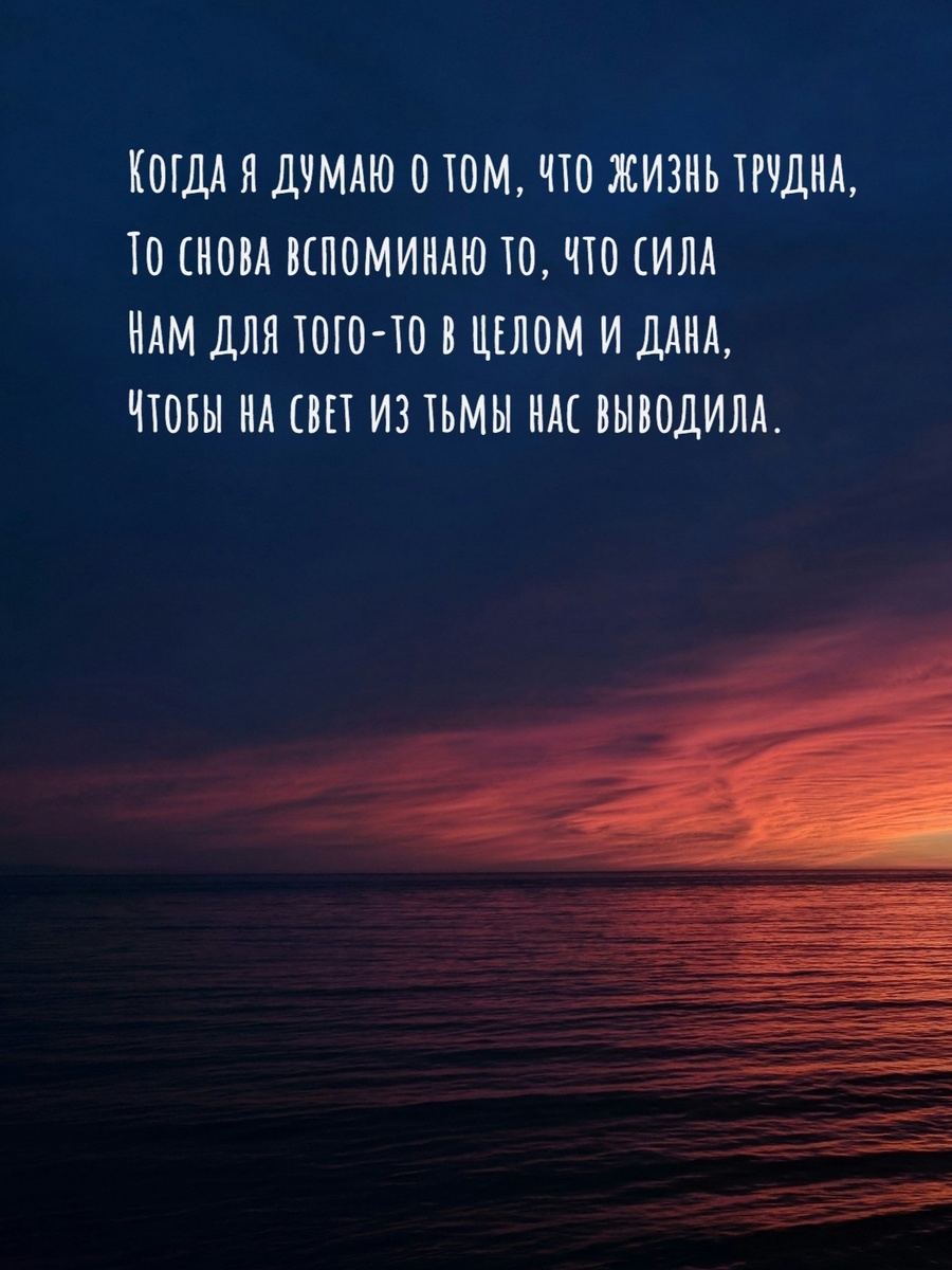 Когда я думаю о том, чего лишён, То снова вспоминаю, что богатство- Смех близких, наполняющий твой дом, Способность чувствовать и улыбаться. Когда я думаю о том, что потерял, То снова вспоминаю, что мой опыт Меня все годы стойко закалял. Я выбирался, хоть тянуло в омут. Когда я думаю о том, что не успел, То снова вспоминаю, я - вне гонки, Где все хотят за хвост поймать успех. Но нужно иногда стоять в сторонке. Когда я думаю о том, что жизнь трудна, То снова вспоминаю то, что сила Нам для того-то в целом и дана, Чтобы на свет из тьмы нас выводила. Малёнкина Эн 08.07.2025 #цитаты #цитата #мысли #стих #стихи #поэзия #литература #жизнь #эмоции #счастье #любовь