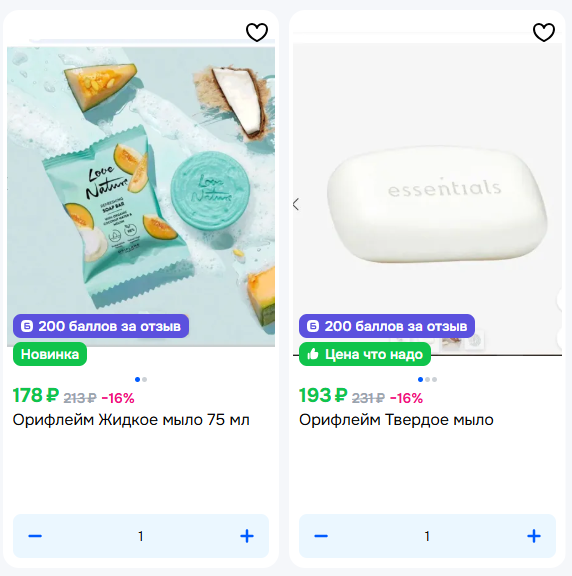 Уже давно на маркетплейсах действует акция "баллы за отзыв". Магазин может подключить эту акцию к своему товару и тогда если вы напишите отзыв на него, через некоторое время вам, возможно, начислят баллы. Я говорю возможно потому, что продавец может успеть отключить акцию пока товар едет к вам. Если он это сделает, то система не предложит написать отзыв и плакали ваши баллы. И это на самом деле хороший повод задуматься и покупать ради участия в акции только товары, которые реально вам необходимы. Покажу несколько товаров, которые я заказала себе по этой акции. Ну и хочу сразу же рассказать, что найти товары - участники данной акции очень просто. Надо при поиске товара в фильтрах поставить галочку "баллы за отзыв" на OZON и "рубли за отзыв на WB, а далее лучше всего отсортировать товары по цене. Я заказала себе кусок мыла Орифлейм и жидкое мыло той же фирмы. Тут очень большой срок доставки товара и велик риск, что продавец отключится от данной акции. Но 2 мыла лишними не будут. Если сис